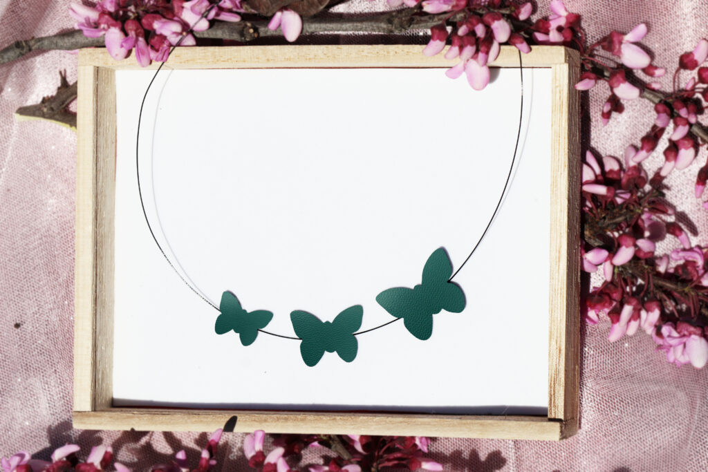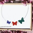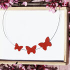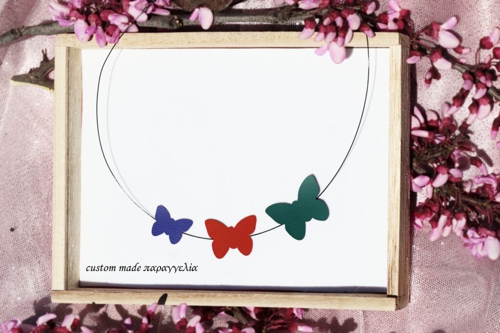 Χειροποίητο κολιέ πεταλούδες. Τα στοιχεία είναι από οικολογική δερματίνη με ατσάλινη κοσμηματική ντίζα και ατσάλινη αλυσίδα με ρυθμιζόμενο μάκρος.